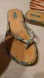 Straw foot bed flip flops with turquoise blue and chartreuse green boho print upper. Size 8. Pre-owned with general signs of wear that can be seen in photos.