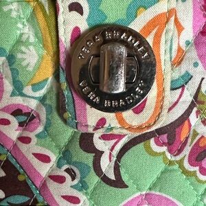 This is a zip-around turn lock wallet from Vera Bradley. It is in the Tutti Frutti pattern, which is a mint green and multicolored paisley. The wallet has a front turn lock with & credit card slots, 2 ID slots, and one bill pocket. The other part zips around, with the inside having 3 bill pockets and 6 credit card slots. There is also a small zippered pocket on the back.