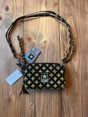 Vera Bradley U.S. Army RFID All-In-One Crossbody Wallet. This functional accessory features the official U.S. Army logo on a classic quilted black background with yellow accents. It includes built-in RFID protection to keep your credit cards secure.