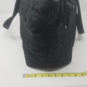 This Vera Bradley Performance Twill Diaper Bag With Changing Pad is in good used condition. There are six interior mesh slip pockets, three exterior pockets. One large exterior pocket has zipper closure and on the other side of the bag are two exterior pockets. The interior and all pockets have a cleanable liner with paisley design. The exterior is black quilted performance twill which is water repellent. The changing pad can be stored in the large zippered center interior pocket or in the large zippered exterior pocket.