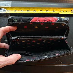 Vera Bradley's ULTIMATE WRISTLET has a front push-lock closure. The front section opens up flat and has 10 credit card slip pockets, a large slip/bill pocket, and two ID slip pockets. The zippered section has one large slip pocket, 6 credit card slips, two open compartments, and a zippered coin pocket. Measures 7 1/4" wide, 4 3/4" high, and 1 1/2" deep with a 6" wrist strap.