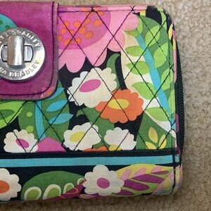 Turn toggle flap at front. 8 card slots, two bill folds. Inner pockets and another bill holder. Back has zipper pocket.