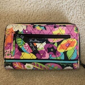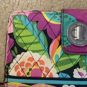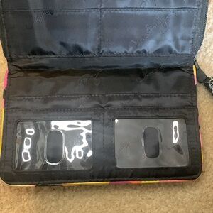 Turn toggle flap at front. 8 card slots, two bill folds. Inner pockets and another bill holder. Back has zipper pocket.