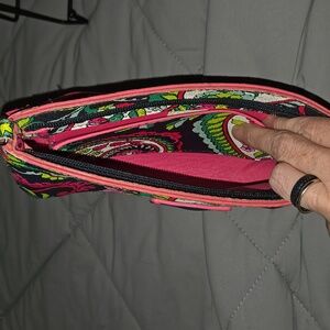 Vera Bradley Vinyl In Petal Paisley Wristlet. Chic floral wristlet clutch with vibrant colors. Perfect for adding a pop of color to any outfit. Top zipper closure with 1 interior pocket.
