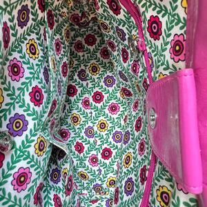 Good preowned condition. Some peeling and cracking to pink band around top of bag/ handles. One darker area of discoloration to exterior of bag as seen in photos.