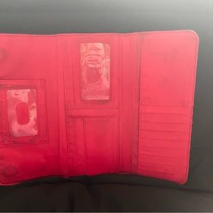 Bright pink, red, and black flowers on this leather trifold wallet. It is so pretty! Little bit of black around inside driver license slot, otherwise excellent condition. I have matching pocket book listed.