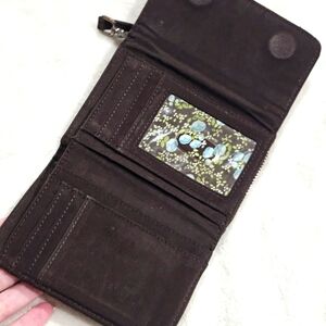 This Vera Bradley quilted wristlet wallet offers timeless utility & brand charm ✦ featuring a brown quilted exterior, vibrant blue & green interior floral pattern & layered organization.