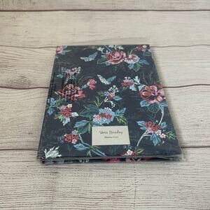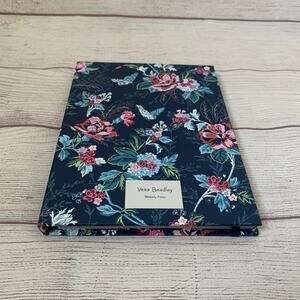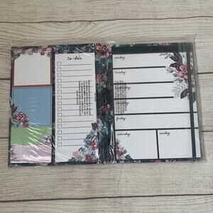 Weekly folio note pad and sticky notes by Vera Bradley. This folio is a hard cover in a Rose Toile pattern with an elastic band closure. The navy blue background has roses, flowers, butterflies, and leaves in teal, light blue, green, white, pink, and red colors. The interior has a weekly layout notepad on the right side. The left side has a To Do notepad, 2 sticky note pads, and 2 flag sticky note pads. It is NEW, in plastic cover. Removed from plastic to take photos.