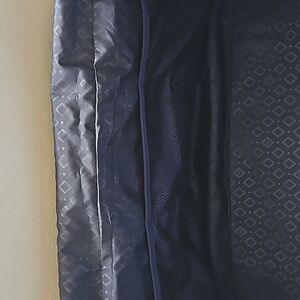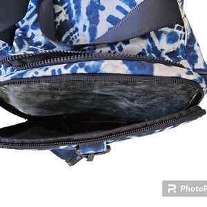 The exterior features a suitcase sleeve with two small slip pockets on either side of the sleeve. It also has two large side zip pockets, one is plastic lined for wet items.