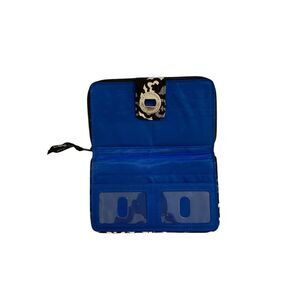 Keywords: Vera Bradley, wallet, blue, women's accessories, zip-around, quilted fabric, geometric pattern, credit card slots, casual, formal, pre-owned, stylish, organized, chic, everyday essential.