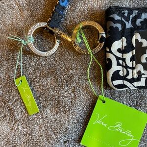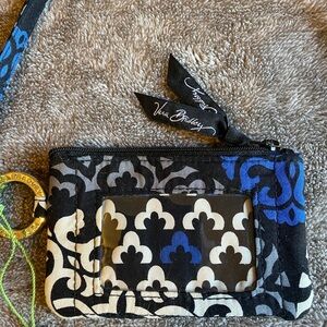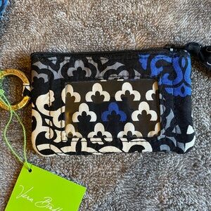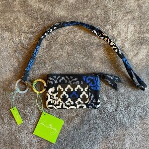 Elegant wristlet with a bold black, gray, and blue design. Includes a handy strap and secure zip closure.