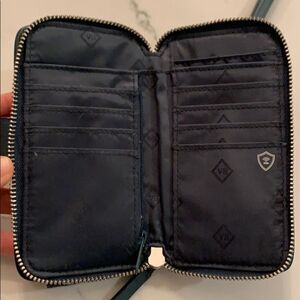 Lots of compartments for cards and outside snap pocket with wristlet