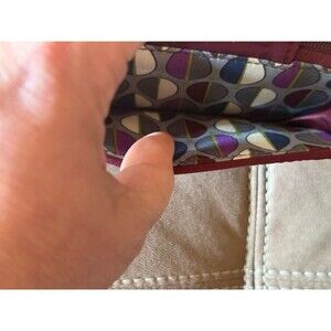 This Vera Bradley wristlet wallet is a perfect blend of style and functionality. The maroon color with a floral pattern and a quilted design makes it a great accessory for any woman. It has a zip-around strap and is made of cotton, making it comfortable to use and durable.