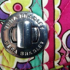 This Very Bradley wristlet wallet offers you additional colorful and compact options for your accessory collection. This quilted and colorful wristlet wallet provides a removable wristlet strap that allows you the option to carry as a wristlet or as just a wallet. This wallet has a twist closure and chrome hardware on the outside while the inside provides one zip closure pocket, four open slots with one spot having three pockets for your ID and cards. This wallet is in like new condition and measures 6.5" X 4.5".