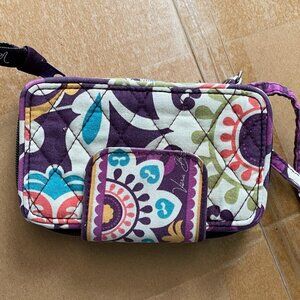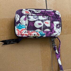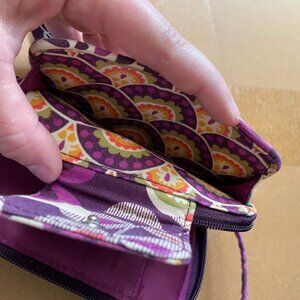 Small Vera Bradley wallet with ID holder, zip and snap closure. Inside zipped pouch has slots for credit/gift cards, snap closure for could hold key fob. Good condition, normal wear. Picture does not show the true color of the fabric.