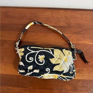 Vera Bradley Black Yellow Paisley Floral Small Clutch Wallet 7" x 3" x 1" girly y2k 2010s preppy travel on the go The Vera Bradley Yellow Bird Paisley All In One Small Wristlet is a stylish and versatile accessory perfect for various occasions. Made of cotton with a vibrant yellow exterior and paisley pattern, this rectangular shape clutch wallet features a zip closure and comes with a convenient wristlet accessory. Ideal for travel, parties, or casual outings, this small-sized wristlet from the trusted brand Vera Bradley adds a touch of flower and bird-themed charm to any outfit.