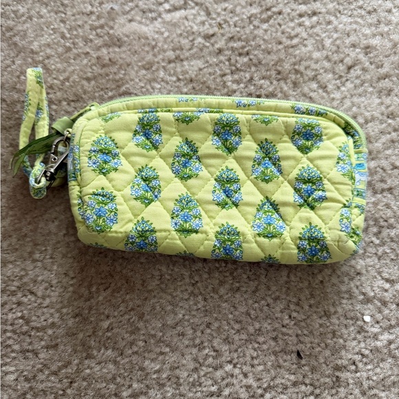 Quilted wristlet with floral pattern. Features a secure zipper closure. Convenient wrist strap for easy carrying.
