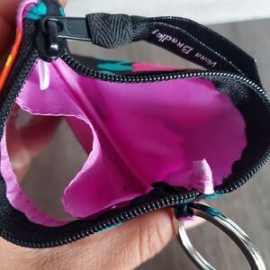 This wallet is in the Hilo Meadow with bright flowers on a black background . It features a zipper top , an ID window, and a key ring.