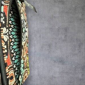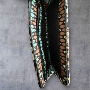 This southwestern pattern was retired by Vera Bradley in 2015. The exterior is quilted cotton and the colors are turquoise, light brown, black, orange, and ivory. Signature Vera Bradley zipper pulls are black. This great wristlet has coordinating cotton and black signature lining.