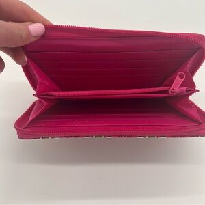 Stylish Vera Bradley zip-around wallet featuring a vibrant pink, green, and white geometric pattern. Designed for maximum organization, it offers multiple card slots, a zippered coin compartment, and ample storage for essentials.