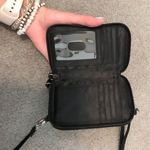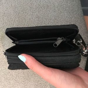 Black Vera Bradley wallet/cross body. Inside has wallet that can hold 5 cards + ID. Separate zipper that can hold other accessories. Strap is detachable so it can be used as a simple cross body or wallet!!