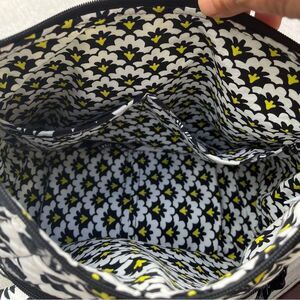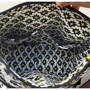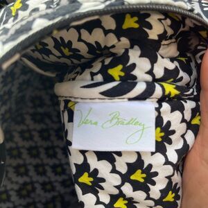Vera Bradley, black and white with neon yellow petals crossbody purse, adjustable belt, one side zipped pocket, two smaller pockets on the other side, full zipper, two internal packets. Inside is in excellent condition. Very light discoloration on the outside, not really visible. Very nice purse.