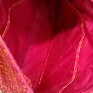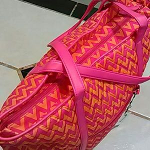 Bright and cheerful chevron stripes in pink and orange, with pink faux leather trim and pink polyester lining inside. Zips closed. 19 x 14.5. Gorgeous! I have this same bag in several other colors too...check them all out. I also have larger and smaller ones in the trimmed tote styles.