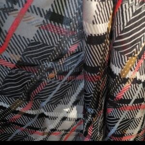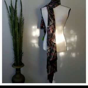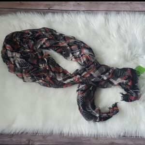 This lightweight scarf features a bold print in black, red, gold, and white. It has an unfinished fringe hem.
