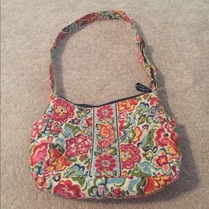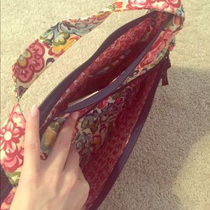 Summery and fun! Perfect condition. Adjustable straps to make the bag a crossover or shoulder bag. Has two side pockets and a zippered pocket on the front. On the inside has three pockets. The design of the bag has vintage flowers.