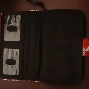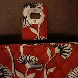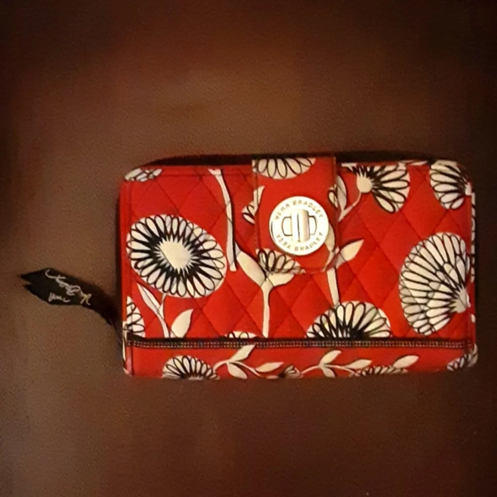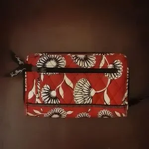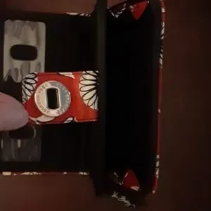 Vera Bradley red white black floral wallet clutch credit card holder. Zippered side pocket. Silver twist latch on strap opens to 2 sided credit card compartment with separate zippered pocket that has more credit card slots and has a divider for great organization. GREAT WALLET!! Closed it is 8" x 5" opens up to 9.5" x 8". Excellent pre owned condition. Smoke free and pet free home