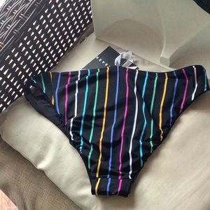 Vera Bradley, reversible bikini size 4-6 bottom striped on one side solid black on the other side small 4 to 6. The top is a solid black top which is a size extra small. It’s got removable pads in it so you can wear this bathing suit two different ways with the striped side, or with the solid black, nylon and spandex. Give them both a good stretch and wash line dryer.💕