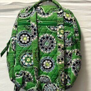 Vera Bradley green multicolored small purse backpack. zippers are intact and the purse is very clean. There is a very small mark on the 3 pictures listed as you can see, it sort of blends with the purse. I am selling this for a great deal given the small mark. The bag has plenty of space.