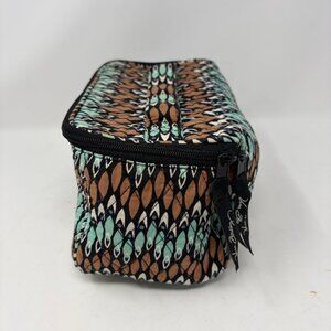 Vera Bradley travel toiletry case. Zips around the top. Quilted fabric exterior. Interesting geometric pattern of tan/brown, black, white, and mint blue/green. A few light smudges on the inside. Exterior has no marks.