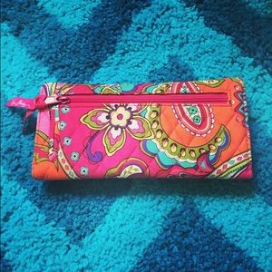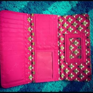 Super cute! Only been used a few times:) it has 12 card pockets and two clear faced pockets to put your driver license or whatever in. It also has two open places inside to put cash in. Finally it has a big pouch to put your loose change in!