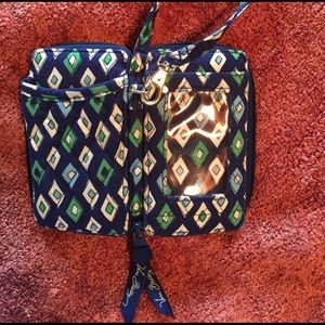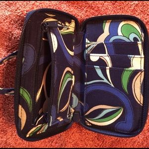 Navy cream and green. Inside has 3 small pockets. One zippered pocket. One other pouch. Front exterior plastic opening for license or other card. Back exterior pocket. Zipper enclosure.