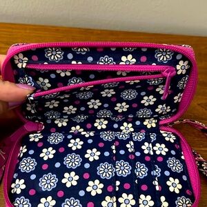 Vera Bradley wristlet. Wrist strap. Zipper closure. ID pocket outside. Pocket on the other side of outside. Inside features 3 credit card pockets, change zipper pocket and one separate pocket behind credit card pockets. Has some wear on the outside.