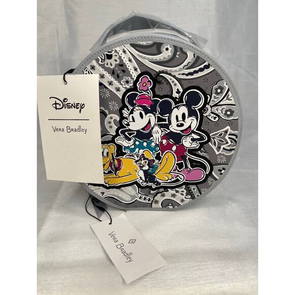 Round bag featuring Disney characters. Gray and black with colorful accents. Vera Bradley Disney Whimsy cosmetic .Mickey Mouse Piccadilly paisley Faux leather .. vinyl interior with net pocket NWT .. new .. clean home cosmetic bag w/handle