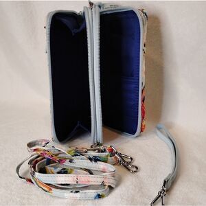 RFID style. Fabric with faux leather accents. detachable crossbody and wrist straps. Sea Air Floral pattern. Approximately 6.75"W x 3.75"T x 2.25"D. No rips, tears or stains. New with tags. The tag has a pink dot because I bought it at a sale. Smoke free/Dog friendly home