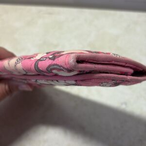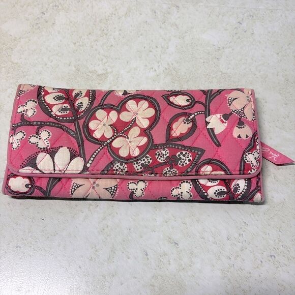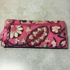 Pink and grey floral pattern long trifold wallet. Zipper pocket along the back of the exterior. Wallet has a magnetic closure. Inside there are 3 cash sized pockets and ample amount of pockets for cards. Colors of wallet are lighter than pictured