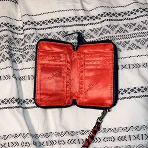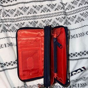 This Vera Bradley zip-around wristlet wallet features a bold geometric and floral print in navy, red, orange, and green with a vibrant coral interior. It’s the perfect compact carry-all with plenty of organization for your essentials.