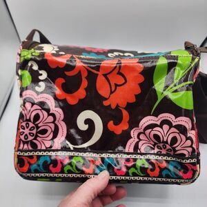 Vera Bradley coated canvas cooler/ lunch box 43" adjustable strap 9"x6"x7" has a stain on bottom & inside as shown in pictures
