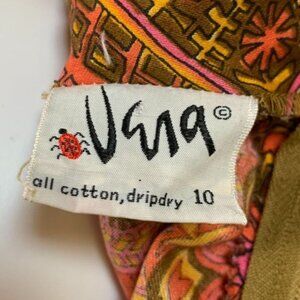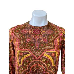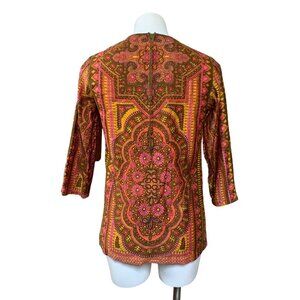 Vintage 1960s Authentic Vera Neumann designer tunic top in a vibrant Modern Moroccan print, a perfect illustration of the feeling of the late 60s era. Olive green, orange, and pink multi colors grace this whimsical print filled with mandalas, paisley, chevron, diamonds, and multi ditsy florals. This top is WILD! Pair with your favorite bell bottoms and hippie beads for the full Hollywood glam effect.