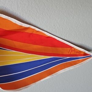 Vibrant scarf with red, blue, orange and yellow stripes. Perfect for adding a pop of color. There are a few marks on the fabric very faint, see close ups. I have not tried to stain treat. 50 x 7.5. neckerchief. angled ends. No fabric content tag.