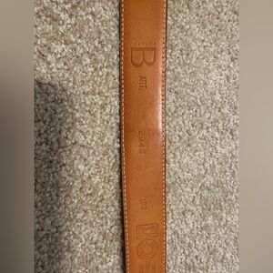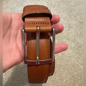 Stylish brown leather belt featuring a sleek silver buckle. Perfect for any outfit.