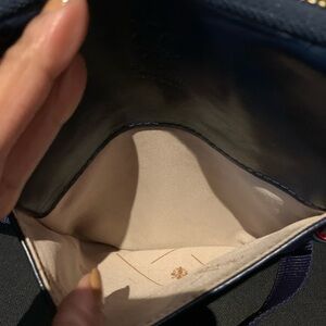 Dark Blue. Italian Leather Crossbody. Adjustable Straps. 3 compartments. Back zipper. Front slide in. Wear on the corners. Gentle wear on the straps.