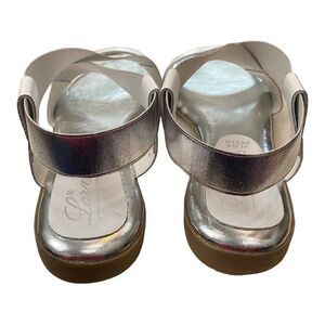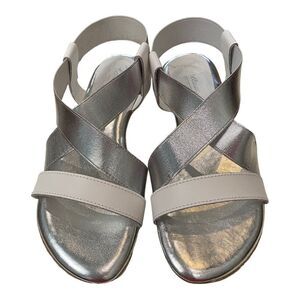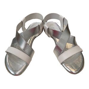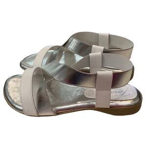 New with Box. Vera Pelle, Lara Collection, silver and white women's sandals. Slip-on. Made in Italy.