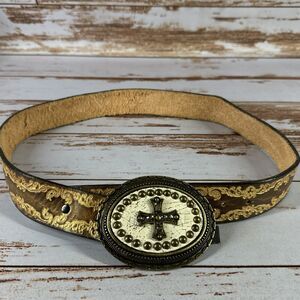 Elevate your style with this Vera Pelle Men's Leather Maltese Cross Belt. Made with high-quality leather, this belt features a solid amber color and a stylish buckle with rhinestone accents. The belt is perfect for men who wear a size 32" - S and is designed to fit any occasion.