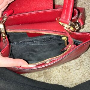 This Vera Pelle striking red satchel is crafted from smooth leather, featuring a structured design with gold-toned hardware. It includes dual top handles and a versatile strap for crossbody or shoulder wear, making it both stylish and functional.