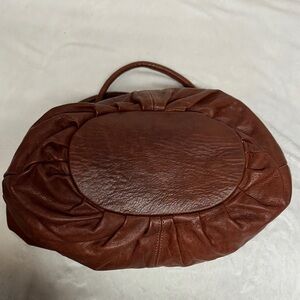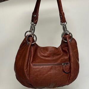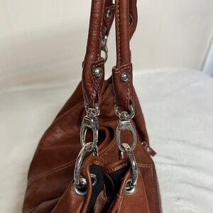 Chic and versatile hobo bag. Crafted from rich brown leather. Features sturdy handles and silver-tone hardware. See all photos as they are part of description
