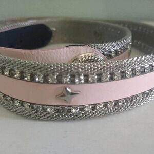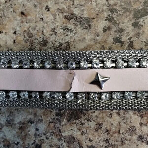 Vintage Country Western leather belt with rhinestones and a buckle, measuring 43" long. Features a repaired crack in the leather, adding character to the piece. Perfect for cowgirls, cowboys, and anyone who loves a touch of western style.